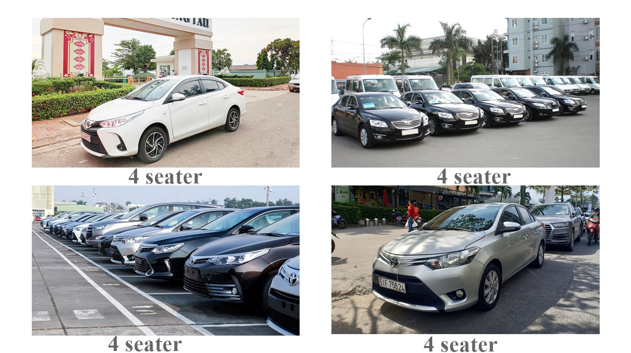 Loại xe du lịch 4 chỗ với những dòng xe mới nhất Hãng Toyota như Camry, Corolla Altis, Vios,… Hãng Honda như Brio, Jazz, City, Civic,…Hyundai: Santafe, Accent,…Hãng Kia như: Morning, Soluto, Cerato, Optima.